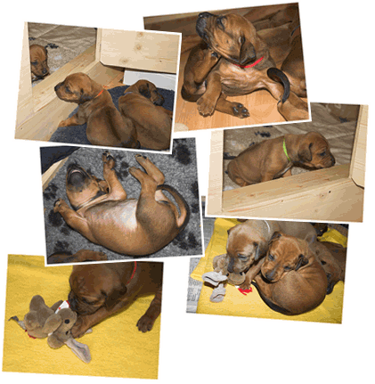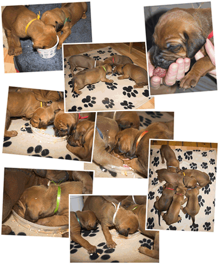 Ihr Hunger ist riesig geworden! Ich bekomme immer noch häufig mein Futter ans „Bett“ serviert, da ich ja viele Stunden bei meinen Kindern verbringe. Allerdings wollen viele kleine Mäuler von meinem Fressen etwas abhaben. Mit erstaunlich akrobatischen Fähigkeiten schaffen sie es immer wieder, in meiner Schüssel zu landen und zu kosten. Obgleich ich immer noch sehr viel Milch habe, haben meine Zweibeiner daher beschlossen, meine Kleinen an eine feste Mahlzeit zu gewöhnen, und so gibt es seit kurzem etwas Tartar für jeden. Und siehe da – sie lieben es! Wenn sie den frischen Geruch des Tartars an den Händen meiner Zweibeiner entdecken, werden sie ganz „jeck“ vor Freude. Und laut schmatzend verdrückt jeder ein kleines Fleischbällchen. Nun ist außerdem eine zweite Mahlzeit aus einer flachen Welpenschale hinzugekommen, bestehend aus Rührei, Körnerkäse und Möhren. Was für eine herrliche Matscherei! Warum müssen Hundekinder eigentlich immer mit den Pfoten im Fressen stehen? Immerhin haben sie schon gelernt, sich selber die Pfoten sauber zu lecken!